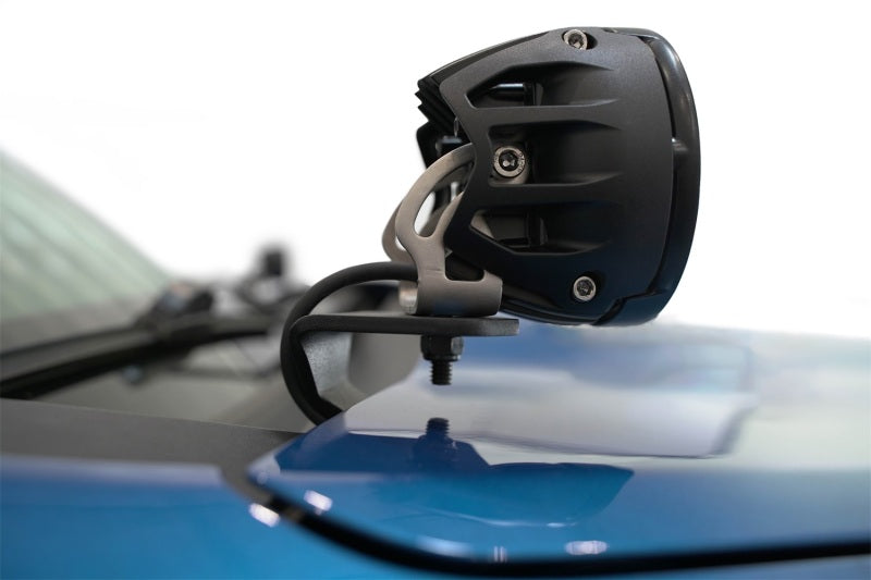 These light brackets mount in a low profile position to both the driver and passenger side hood hinges, keeping them out of your sightlines. They can be oriented forward or off to the side to be used as ditch lights. Capable of mounting a single 3-inch cube light on up to a 6-inch round light, they maintain rigidity on or off the road. The light brackets were designed for clean wire management. Made from 3/16-inch American steel and finished in a durable 2-stage hammer black powder coat, these are fully bolt on and Made in the USA.