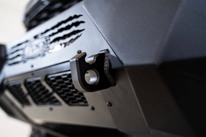The HoneyBadger front bumper is known for its sharp angles and rugged style. This bumper is available with, or without a top hoop. The top of the bumper has a light mount for a 30- in. radius LED light bar. An additional 20- in. LED light bar can be mounted behind the central panel. Single 10 in. SR lights can be mounted behind each of the side panels.The HoneyBadger Raptor front bumper was designed to follow the body lines of the truck perfectly, while bringing a more aggressive edge to its stance. The steel is finished in a hammer black powder coat, while the aluminum panels are finished in a satin black powder coat. There are sensor holes to retain the OEM parking sensors, and sensor hole plugs are supplied if your Raptor does not have front sensors. The OEM tow hooks fit perfectly underneath the bumper.