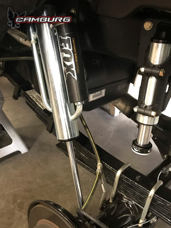 When a shock going through the bed is not an option, our performance shock mount kit is the solution. We yield maximum wheel travel and control using specific FOX or King 2.5 or 3.0 bypass shocks. You will need a specific bypass tube layout for proper clearances. We developed and tested this setup out on the trails in Moab, Utah to the sand dunes in Glamis, CA and everything in between, all while being used as a daily driver. No other bolt-in shock will give you the comfort, control and articulation this kit delivers. The shocks we sell are custom built and valved specific for this kit; there's more to them than just tube locations. The powder coated upper shock mount bolts to the frame using a pre-existing hole for proper placement and you will need to drill some additional holes in the frame. The lower shock mounts need to be welded to the housing, so minor fab work is involved along with cycling the rear suspension and removing the factory shock mounts. We suggest an off-road shop installing this, if you're not familiar with welding/grinding/cutting and suspension cycling. The factory upper and lower shock mounts will need to be removed. We designed this kit to be used with Deaver K-37 or U-748 springs or the equivalent and our bolt-on bump stop kit for the ultimate undercover setup. We also highly recommend using our extended length rear brake line kit for maximum wheel travel. Increased wheel travel Under bed design Fits up to a 3.0 bypass shock You will need a specific bypass tube layout for proper clearances.