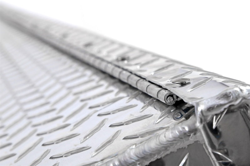 Dee Zee Tool Box - Red Label Single Lid Crossover. Constructed of heavy duty Brite-Tread aluminum. Crown style lid with a full pan double-V stiffener for superior rigidity. Other features: lockable stainless steel paddle handles, dampened gas shocks, closed cell foam gasket, and self-adjusting strikers. Removable plastic tool tray to help keep small items organized.
