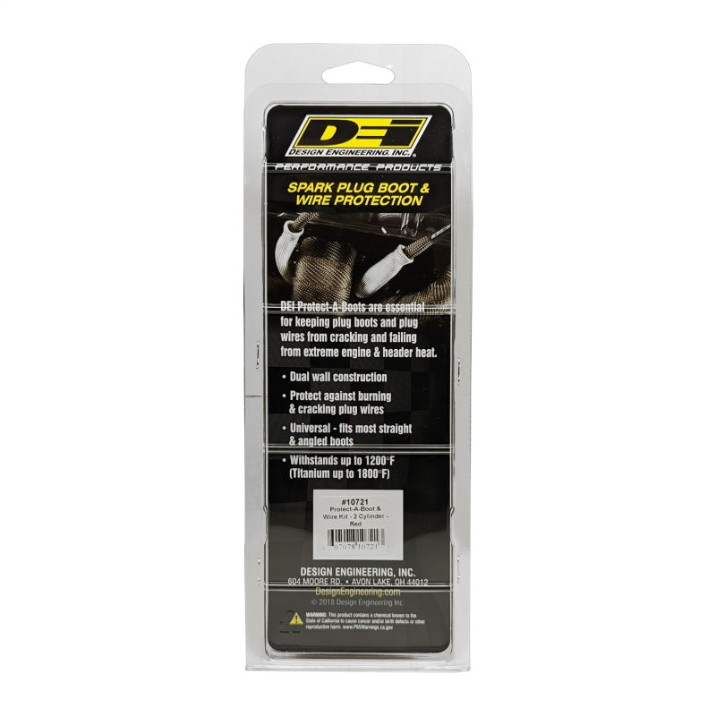 Protect-A-Boots solve the problem of burning and cracking plug boots and wires from header and engine heat. Each kit includes everything needed to protect spark plug boots and wires from harmful under hood heat. Color matched Protect-A-Boots, Protect-A-Wire and Hi-Temp Shrink Tubes are included for a professional finished look. Our 6'' Protect-A-Boots come with a reinforcement ring at the base for easy plug removal during maintenance. When working on boots with tight bends, try our ringless 8'' Protect-A-Boot (only in silver or Titanium(TM)) instead. For thicker boots, like MSD or Taylor's, we recommend our Protect-A-Boot(TM) Sleeves; the 1.25'' diameter will allow for a simple install. Boots & sleeving are constructed from a high temperature resistant glass fiber material 2 Cylinder Kit Contains: 7 ft of Line Sleeving 6 - Hi-Temp Shrink Tubes 2 - Protect-A-Boots