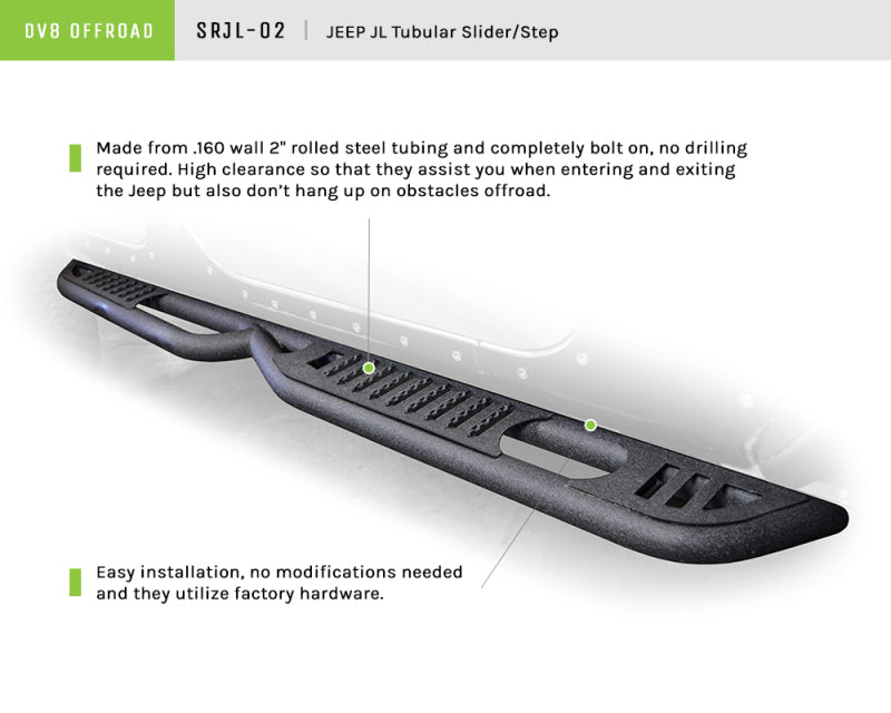 DV8 Off Road Tubular Side Step Rock Sliders are a trail tested and proven design. Made from .160 wall 2 inch rolled steel tubing and completely bolt on, no drilling required.