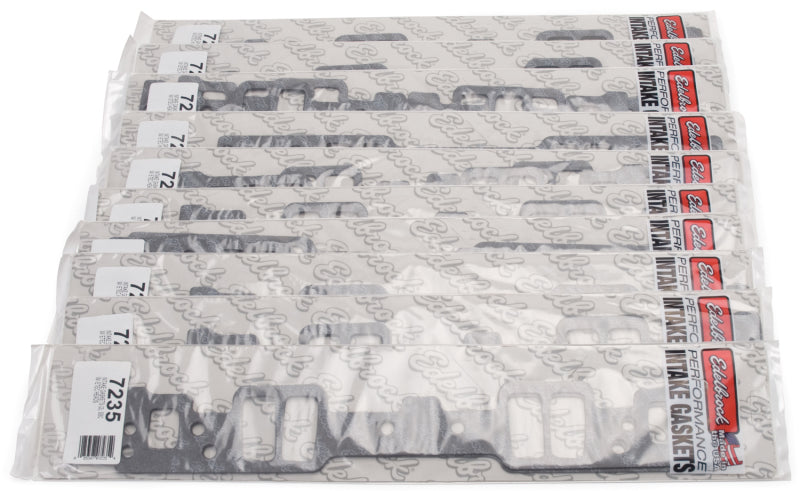 Edelbrock part #72358 Bulk Pack Intake Gaskets for E-Tec 170 Small-Block Chevy allow for optimum flow and performance. Any gasket can create a seal, but a good gasket can do it with less clamping force, and for a longer period of time. The new MP-2N Micropore technology does not use solvents making our gaskets environmentally friendly. Impervious to most chemicals, this synthetic fiber composite provides a high recovery under load. This means that when compressed, the gasket will conform to any imperfections on the sealing surface even using lower flange pressures. A nitrile bead around each port opening makes the seal even better.