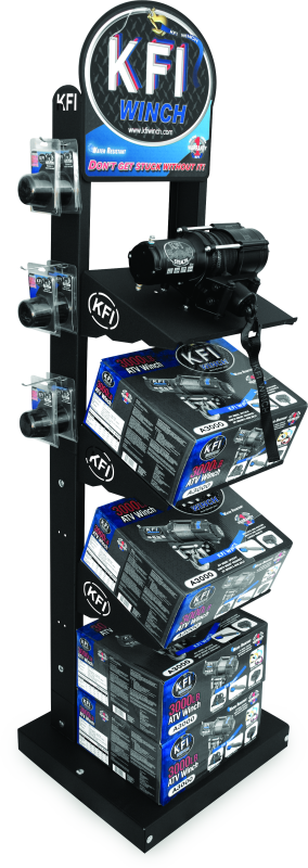 Standing display holds up to five winches and includes side channels with eye hook holes for hanging accessories.