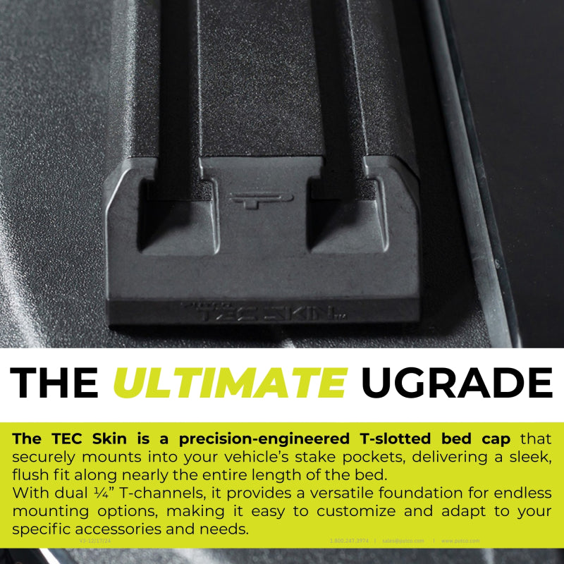 Enhance the functionality and versatility of your truck bed with the Putco TEC™ Skins T-Slot Bed Rail Caps. This innovative solution is engineered with a solid-core aluminum dual T-channel system, providing exceptional strength and a lightweight structure. It boasts the highest weight capacity in its class, ensuring secure hauling of heavy equipment, outdoor gear, and oversized loads. The dual ¼” T-channels establish a robust foundation, while the patented stake pocket installation guarantees a drill-free and rock-solid fit, enhancing stability.Suitable for contractors, outdoor enthusiasts, and weekend warriors alike, the TEC Skin™ adapts seamlessly to your needs. Whether transporting ladders to the job site, mounting bikes and kayaks for your next adventure, or creating a customized setup with accessories like cargo racks, crossbars, and rooftop tents, the TEC™ Skins T-Slot Bed Rail Caps deliver exceptional performance and exceed expectations.Compatible with most in-bed tonneau covers, the TEC™ Skins T-Slot Bed Rail Caps allow you to utilize your preferred bed cover without compromising strength and weight capacity. Many T-slot systems rely on weak points, such as clamp systems, which are not engineered to handle static or dynamic weight. In contrast, our system is truck-specific, ensuring a precise fit. Most applications can be installed in minutes without drilling or modifications.Designed and manufactured in the USA by Putco in Des Moines, IA, the TEC Skin™ is a testament to our commitment to quality and innovation.