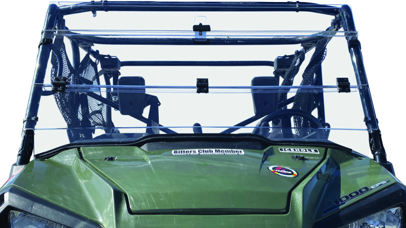 Folding windshield constructed from premium 0.177 in. thick, optically clear polycarbonate material that can be hinged up or down to increase or limit airflow in the cabin.