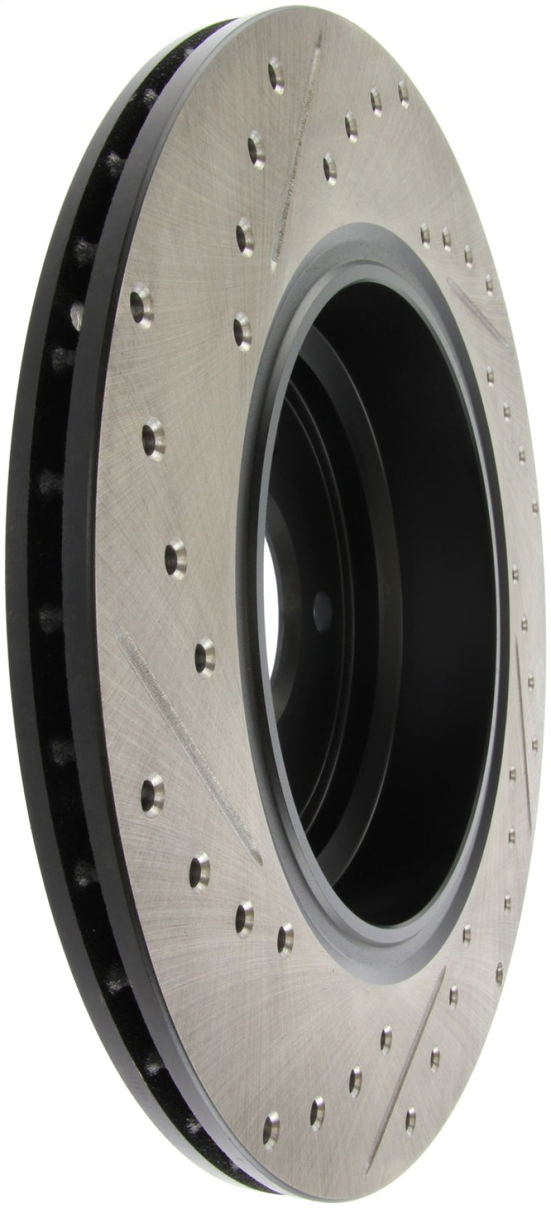 StopTech Drilled and Slotted Sport Rotors are 1-piece direct replacement brake discs for factory brake systems and stock calipers that look great behind your wheels – and offer significantly improved braking performance. The unique cross-drilling and slotting aids with heat and brake dust dispersal; prevents glazing of the pads; adds bite and improves wet and dry braking performance. Built to last; the black e-coating provides protection from corrosion and the high carbon metallurgy (in most applications) offers quieter operation; better crack resistance and increased performance.